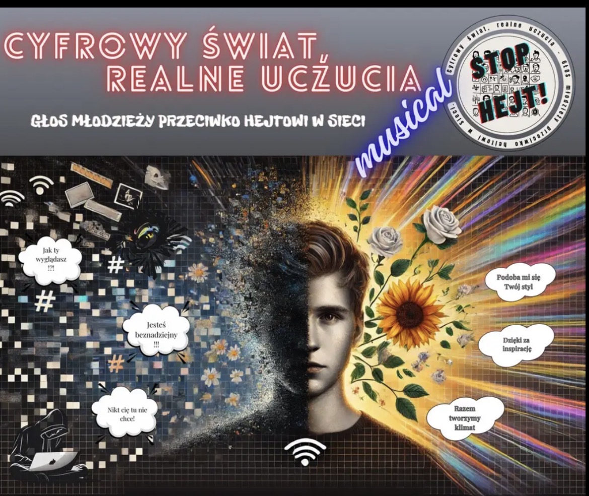 W marcu klasy VI wybrały się do grodziskiego Centrum Kultury na muzyczną opowieść o tym, co dzieje się w sercu młodego człowieka, gdy gasną ekrany smartfonów. Musical „Cyfrowy świat – realne uczucia” ukazuje, że hejt w sieci to często wierzchołek góry lodowej, pod którym kryją się:
