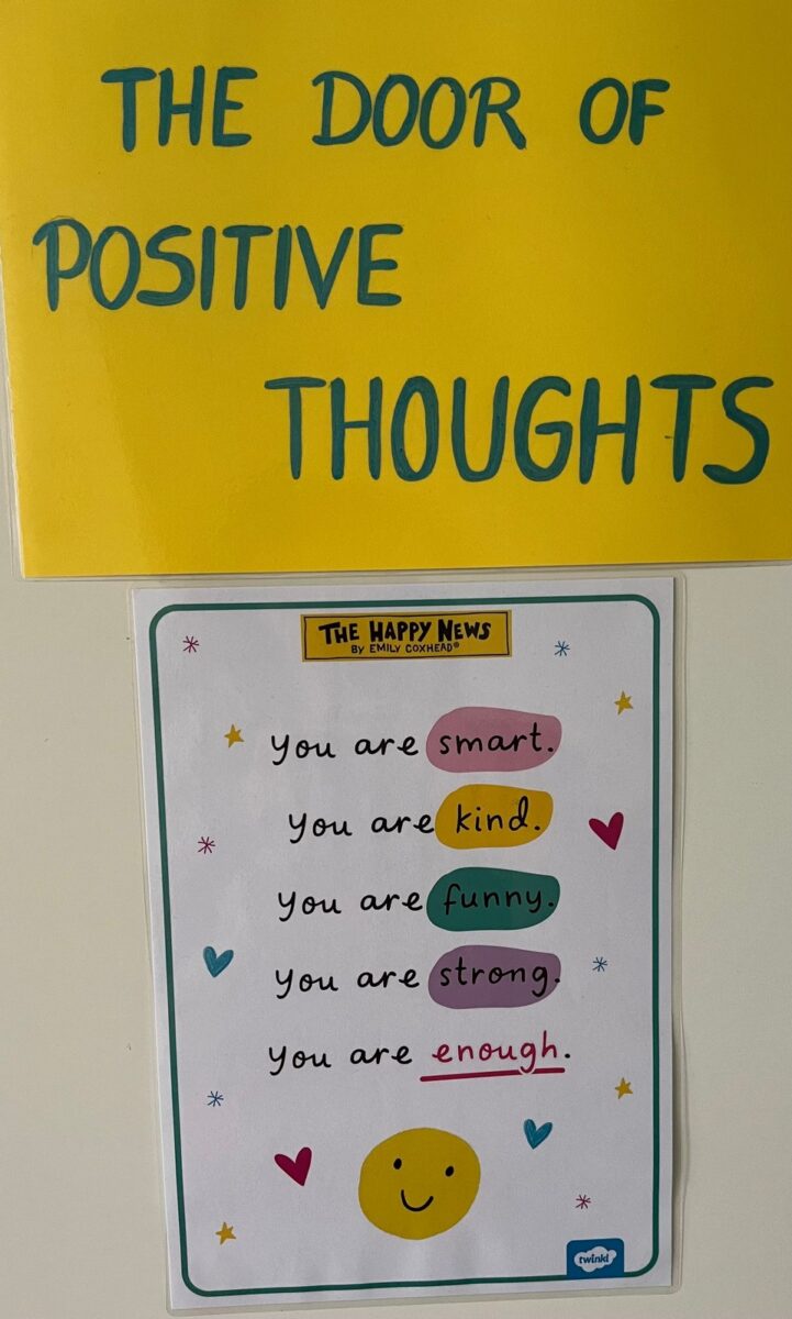 W ramach systemu wzmocnień pozytywnych adresowanych do uczniów jedne z drzwi w naszej szkole stały się „drzwiami pozytywnych myśli”.