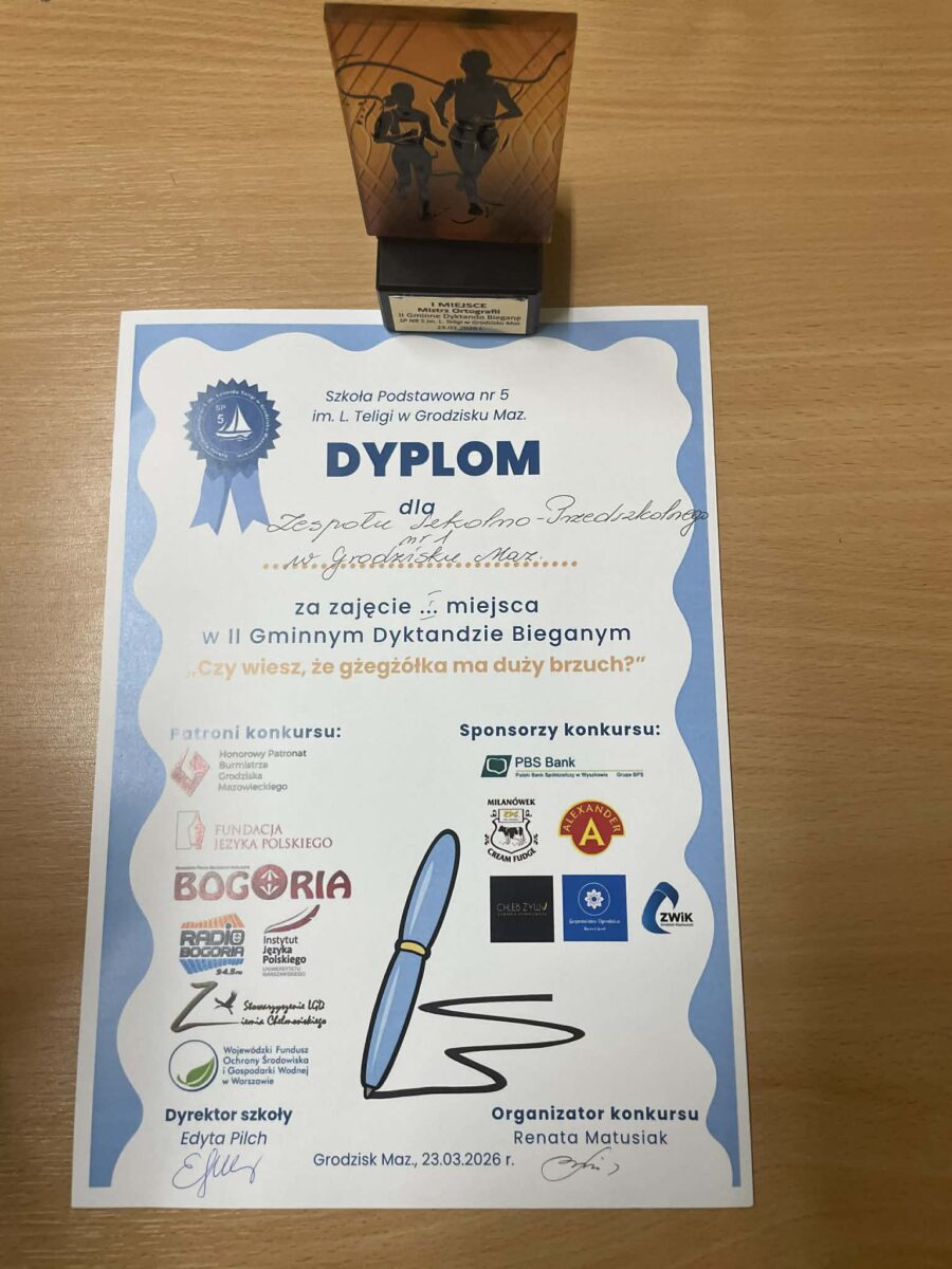 23 marca w Szkole Podstawowej nr 5 w Grodzisku Mazowieckim odbyło się II Gminne Dyktando Biegane „Czy wiesz, że gżegżółka ma duży brzuch?” Naszą szkołę reprezentowali uczniowie klas drugich w składzie: Lidzia G. 2a, Sofiia K. 2a, Staś B. 2b, Antoś Sz. 2b, Tadzio Cz. 2c. Nasi drugoklasiści spisali się znakomicie i zajęli zaszczytne I miejsce! To ogromny sukces, który pokazuje jak wiele serca i pracy dzieci włożyły w przygotowania. Brawo drugoklasiści! Gratulujemy, jesteśmy z Was bardzo dumni!