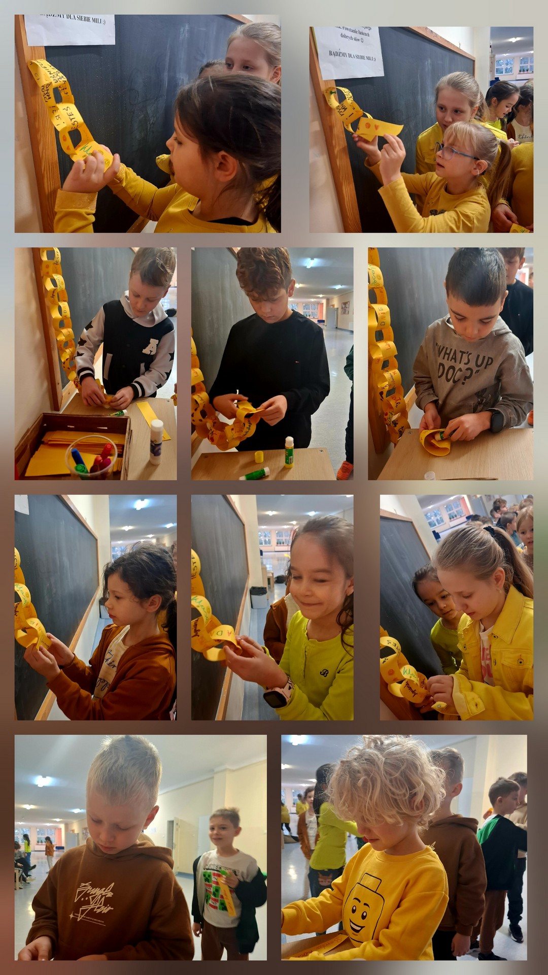 Od rana uczniowie klas 1-3 mogli zapisywać pozytywne myśli, słowa wsparcia i podziękowania na kartonikach. Następnie wszystkie paski były łączone, tworząc długi łańcuch- symbol życzliwości łączącej uczniów i tworzącej między nimi więzi.