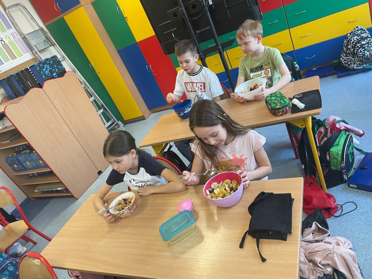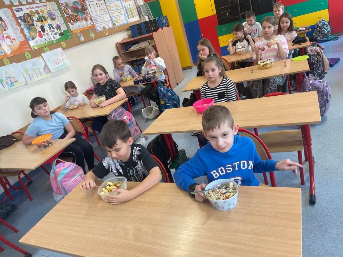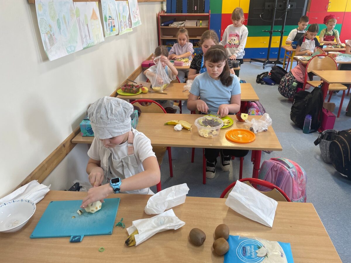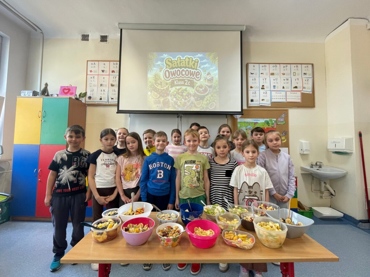 Uczniowie klasy 2c przygotowywali zdrowe i kolorowe sałatki owocowe. Rozmawialiśmy także o zdrowym stylu życia – o tym, jak ważne jest jedzenie owoców, ruch na świeżym powietrzu i dbanie o swoje zdrowie. Na końcu wszyscy spróbowali swoich sałatek. Było smacznie i bardzo wesoło! 🍓🥝🍊