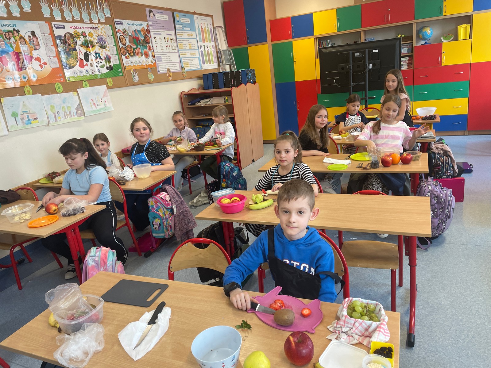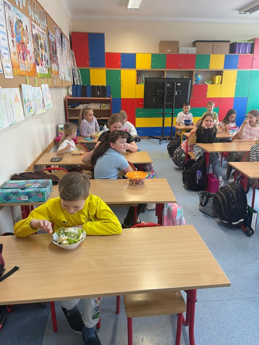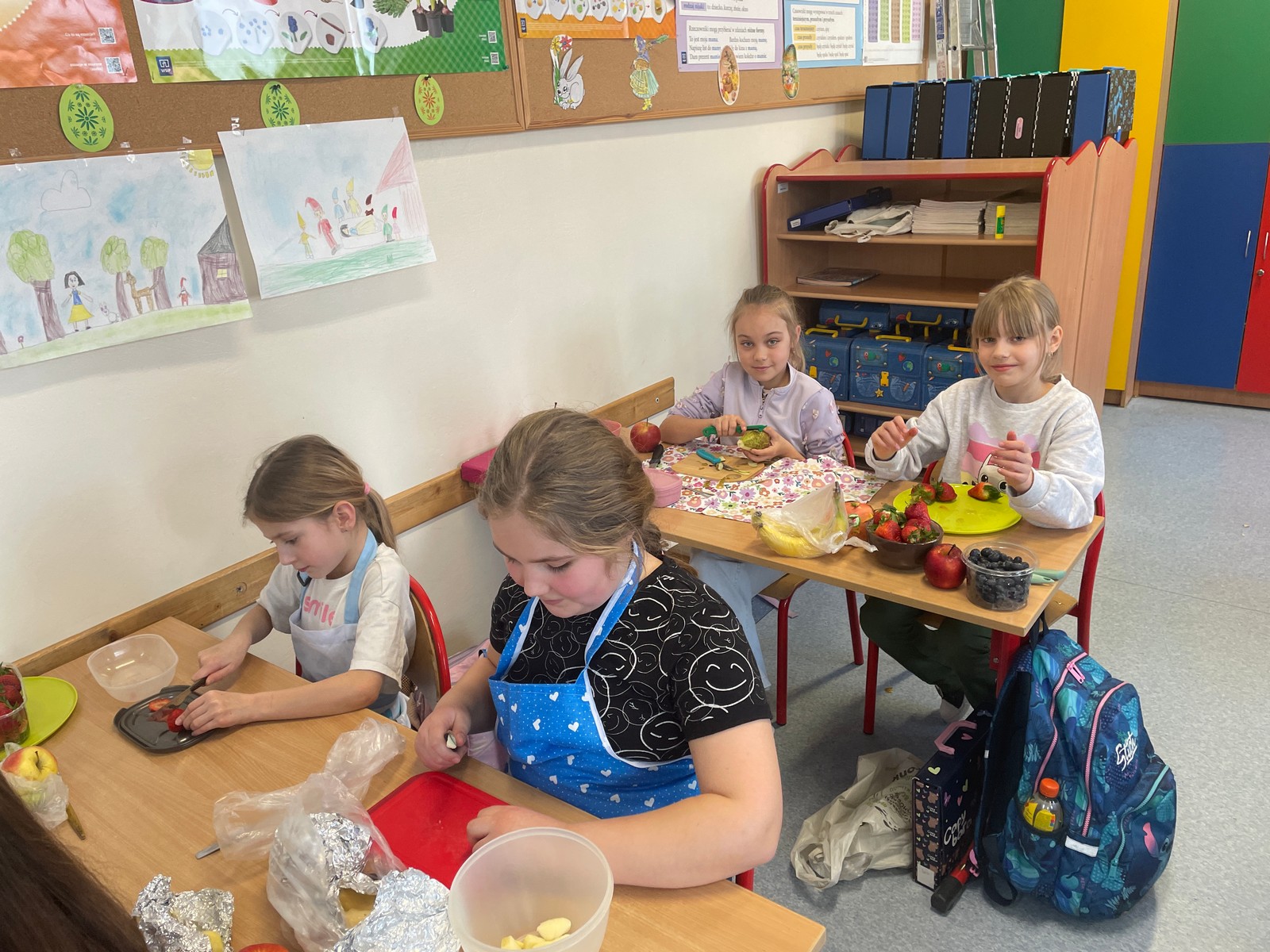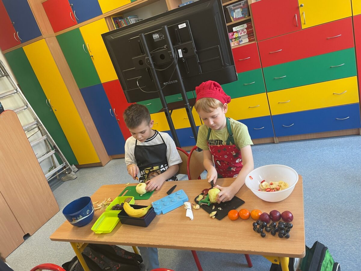 Uczniowie klasy 2c przygotowywali zdrowe i kolorowe sałatki owocowe. Rozmawialiśmy także o zdrowym stylu życia – o tym, jak ważne jest jedzenie owoców, ruch na świeżym powietrzu i dbanie o swoje zdrowie. Na końcu wszyscy spróbowali swoich sałatek. Było smacznie i bardzo wesoło! 🍓🥝🍊