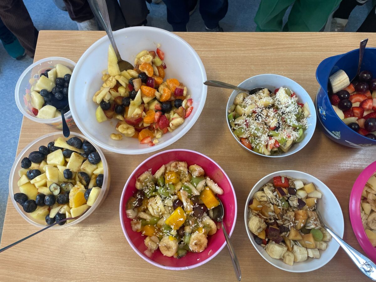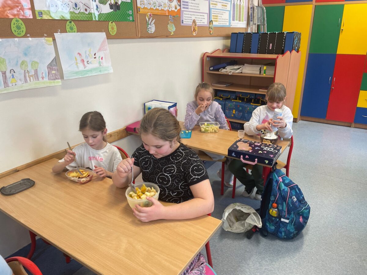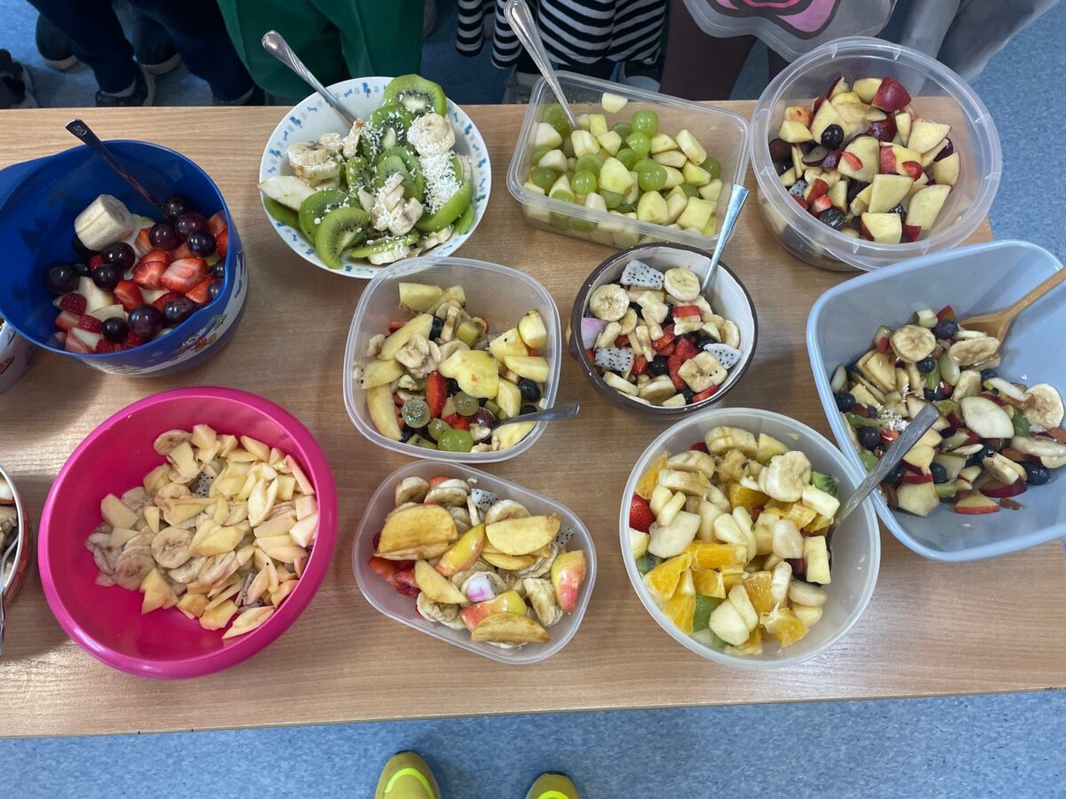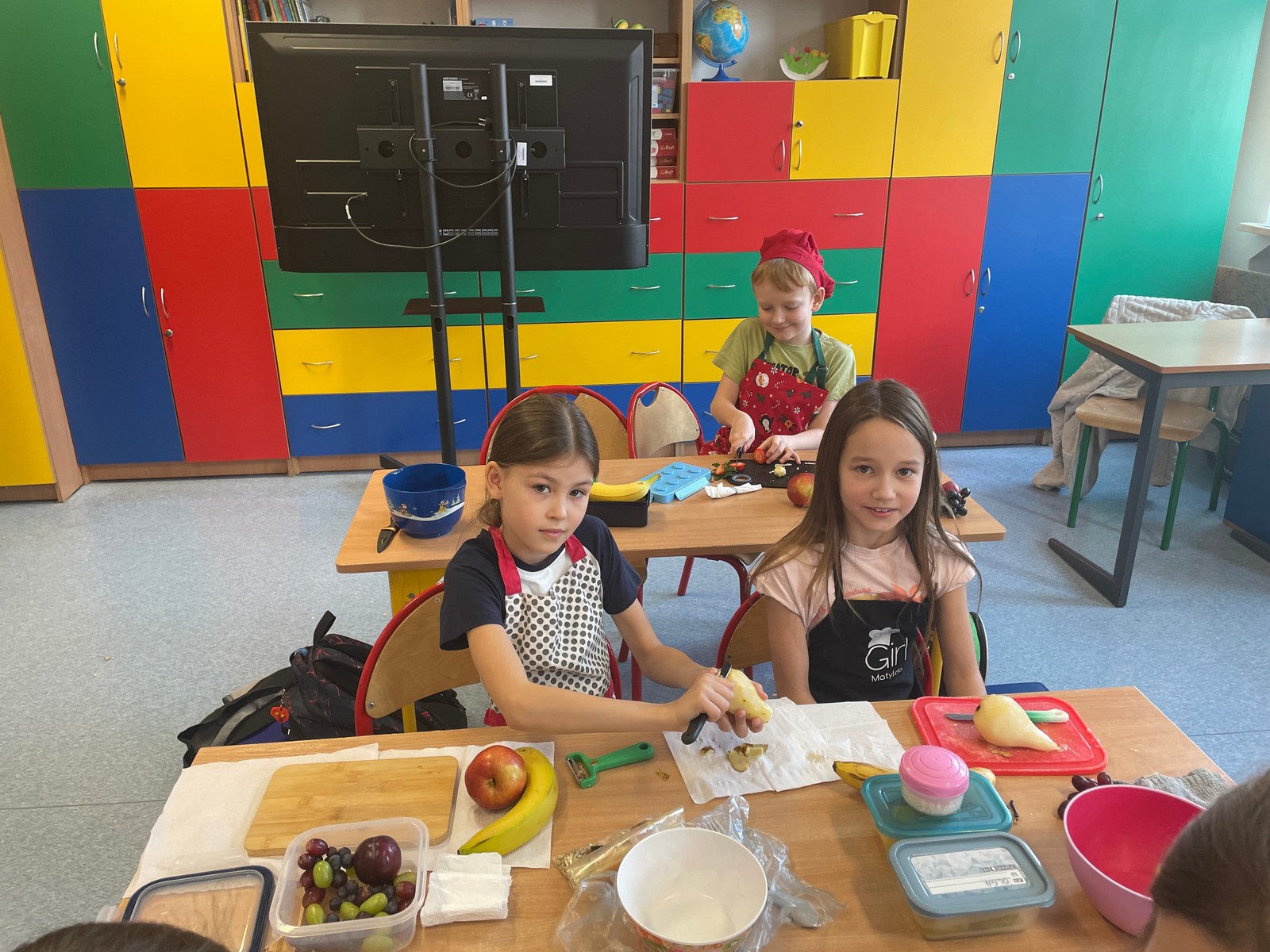 Uczniowie klasy 2c przygotowywali zdrowe i kolorowe sałatki owocowe. Rozmawialiśmy także o zdrowym stylu życia – o tym, jak ważne jest jedzenie owoców, ruch na świeżym powietrzu i dbanie o swoje zdrowie. Na końcu wszyscy spróbowali swoich sałatek. Było smacznie i bardzo wesoło! 🍓🥝🍊