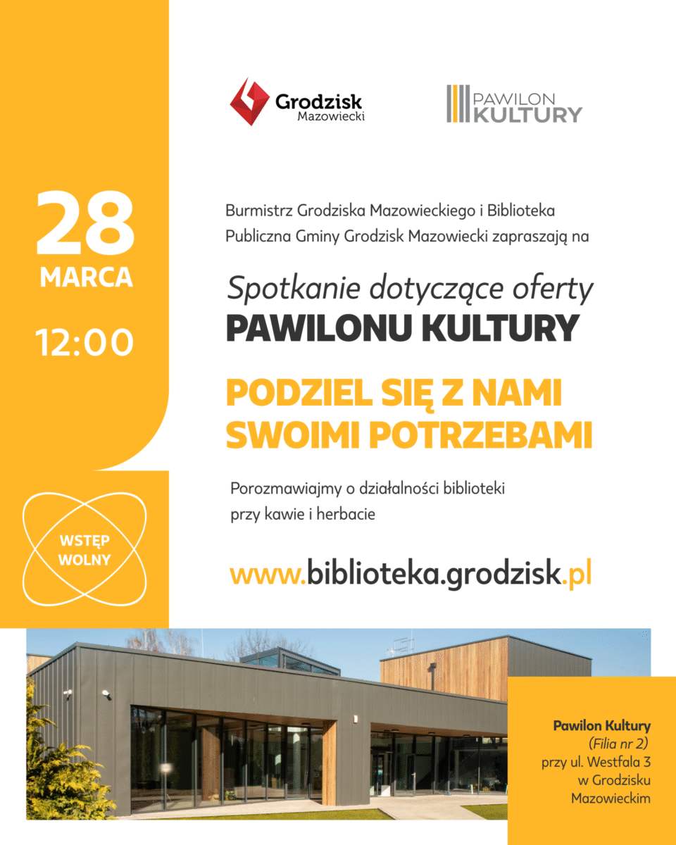 Burmistrz Grodziska Mazowieckiego, Tomasz Krupski oraz Biblioteka Publiczna Gminy Grodzisk Mazowiecki zapraszają mieszkańców na spotkanie konsultacyjno-informacyjne dotyczące rozwoju oferty bibliotecznej Filii nr 2, Pawilonu Kultury.