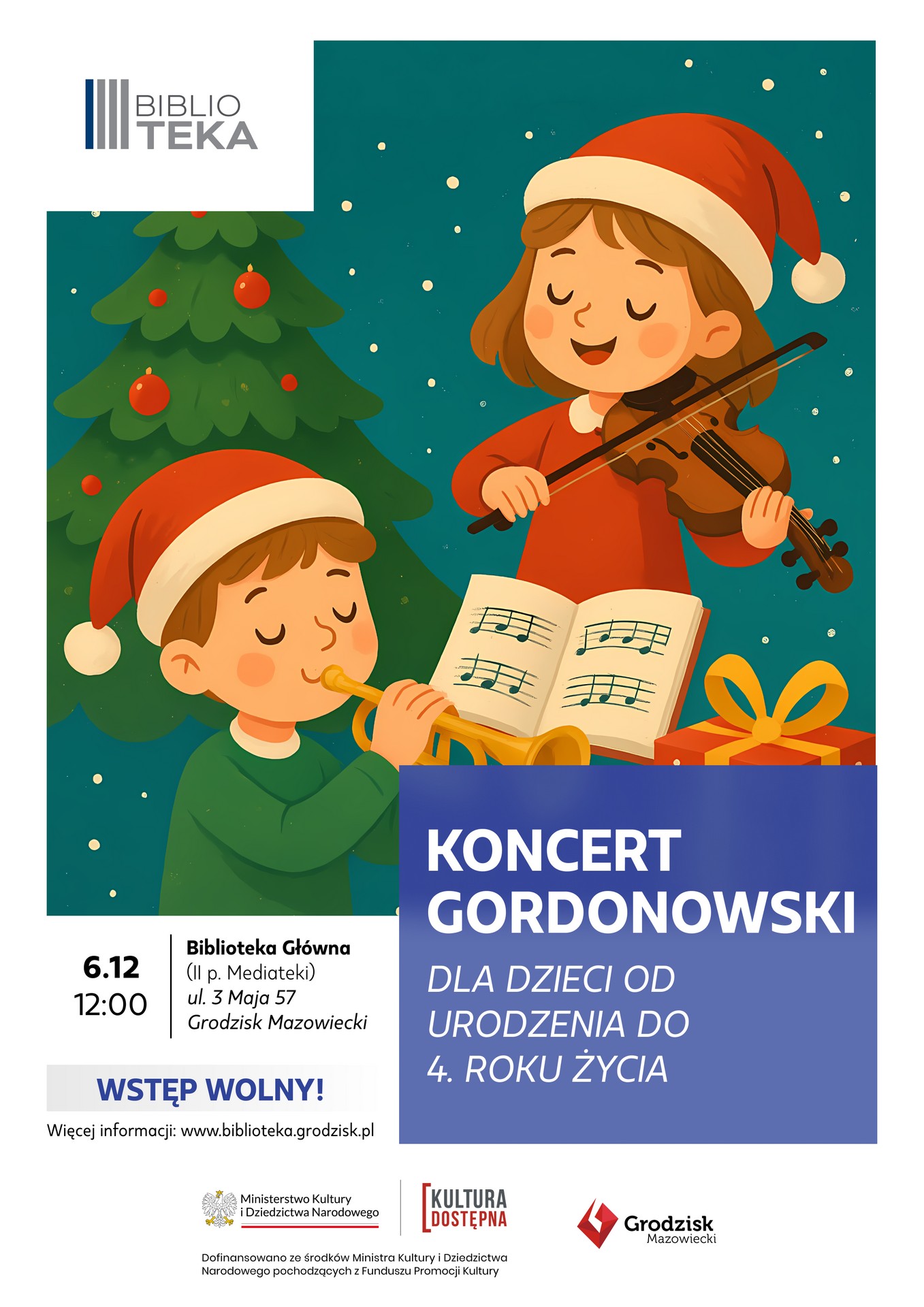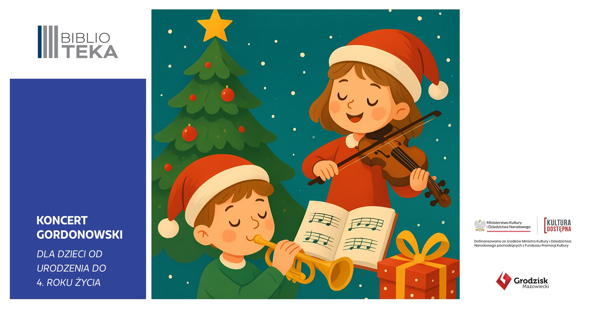 Biblioteka Publiczna Gminy Grodzisk Mazowiecki i Burmistrz Grodziska Mazowieckiego, Tomasz Krupski, zapraszają na świąteczny koncert gordonowski dla rodzin z małymi dziećmi.