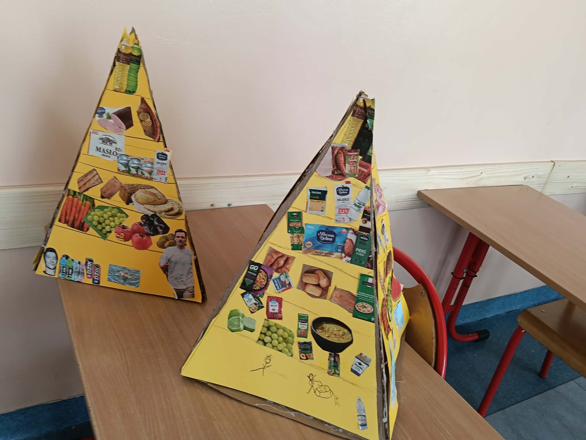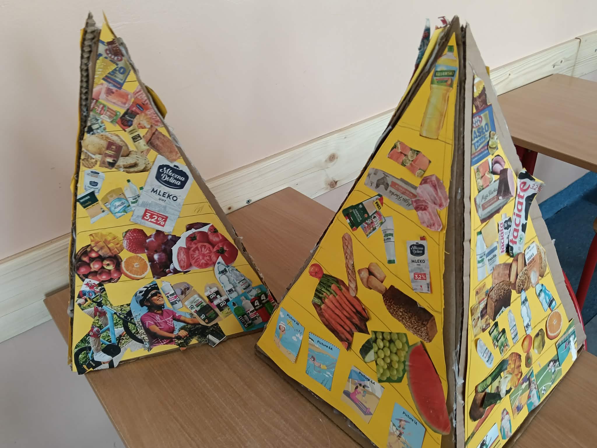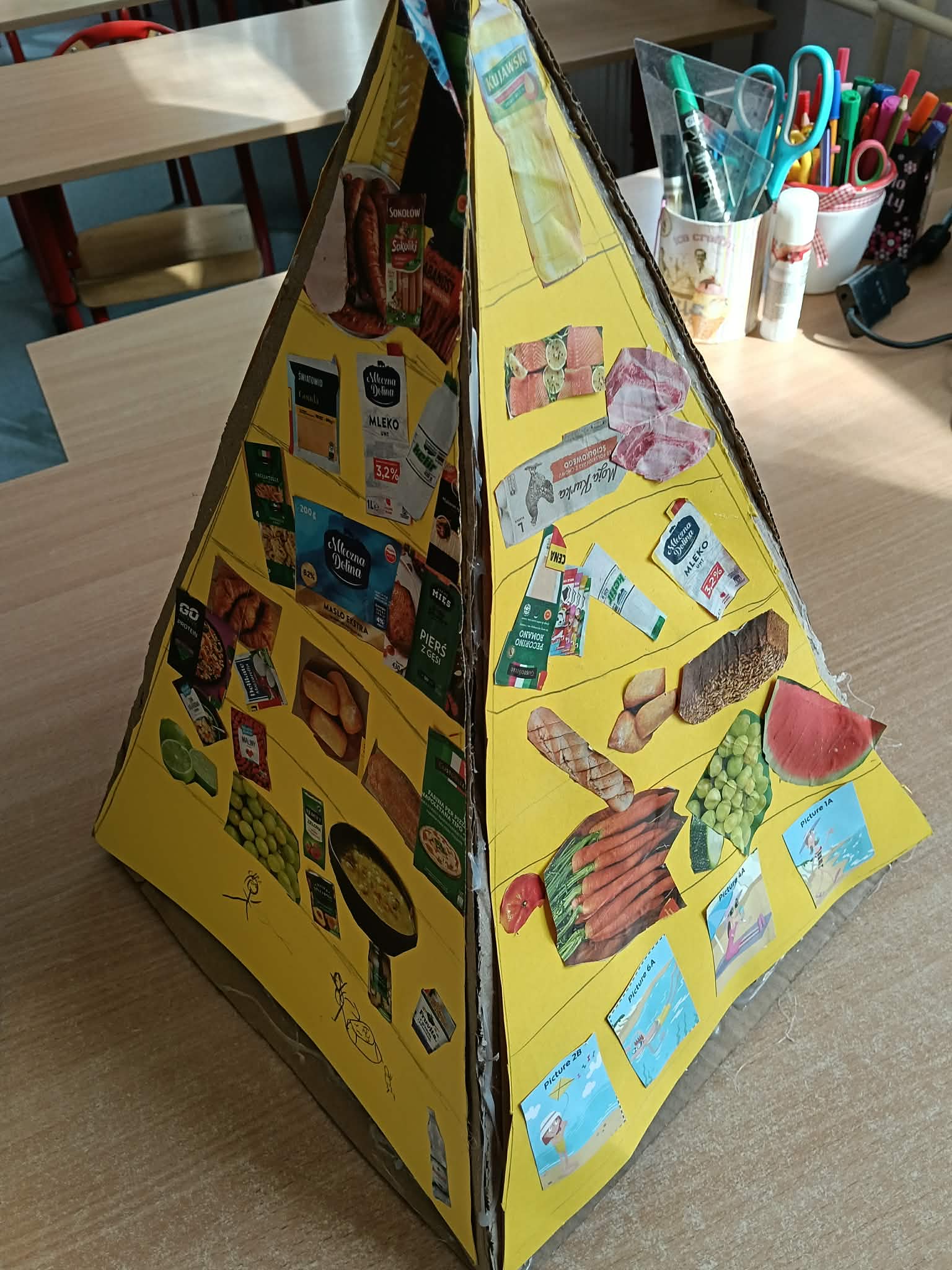 Na początku zajęć uczniowie zapoznali się z Piramidą Zdrowego Żywienia i Stylu Życia Dzieci i Młodzieży. Dzieci aktywnie dyskutowały o tym, że podstawą zdrowia jest nie tylko jedzenie warzyw i owoców, ale także codzienna aktywność fizyczna oraz picie wody. Następnie, pracując w grupach, dzieci samodzielnie wykonały kreatywne, przestrzenne piramidy, umieszczając na odpowiednich poziomach produkty zdrowe oraz wskazując te, których należy unikać.