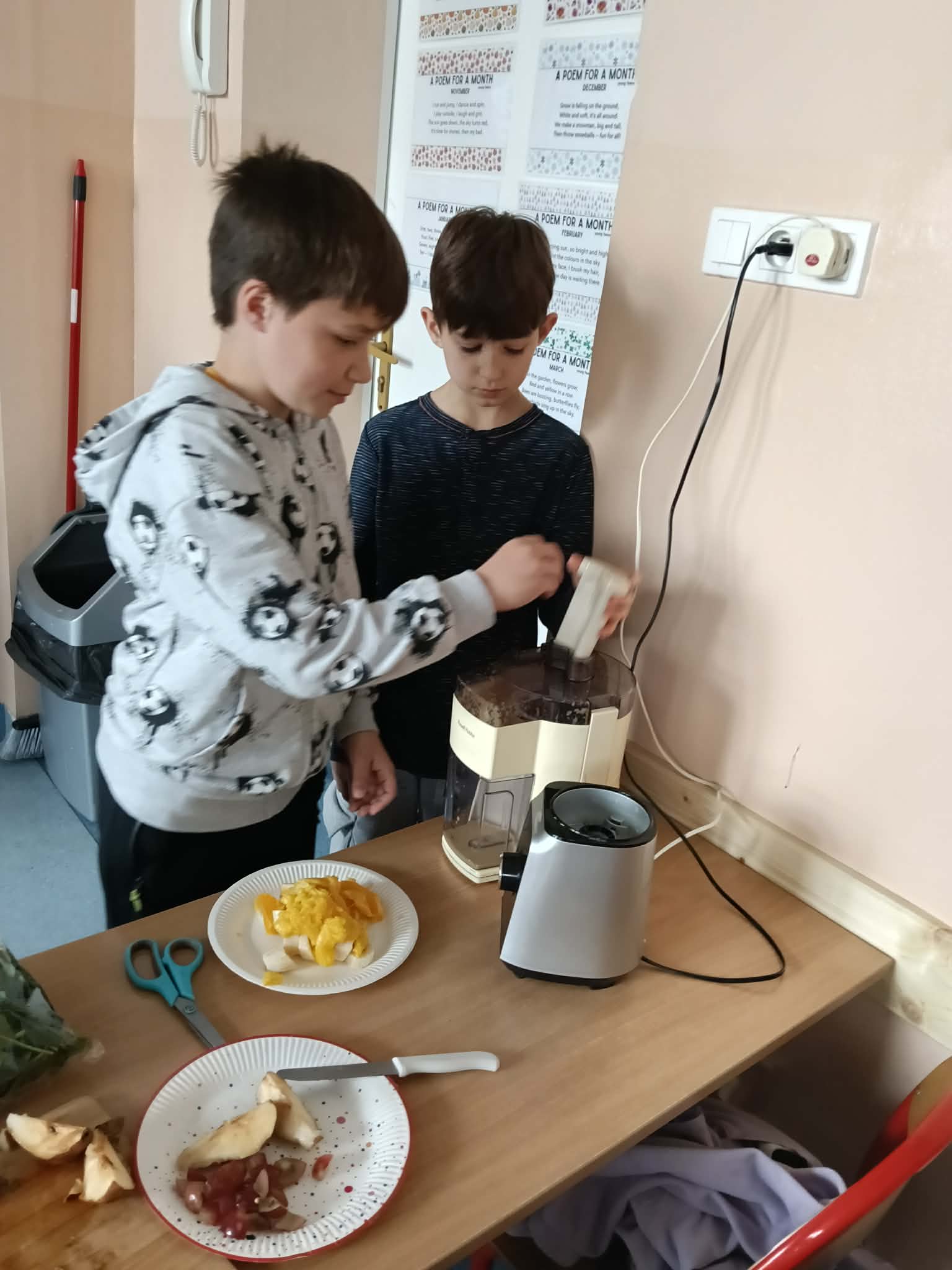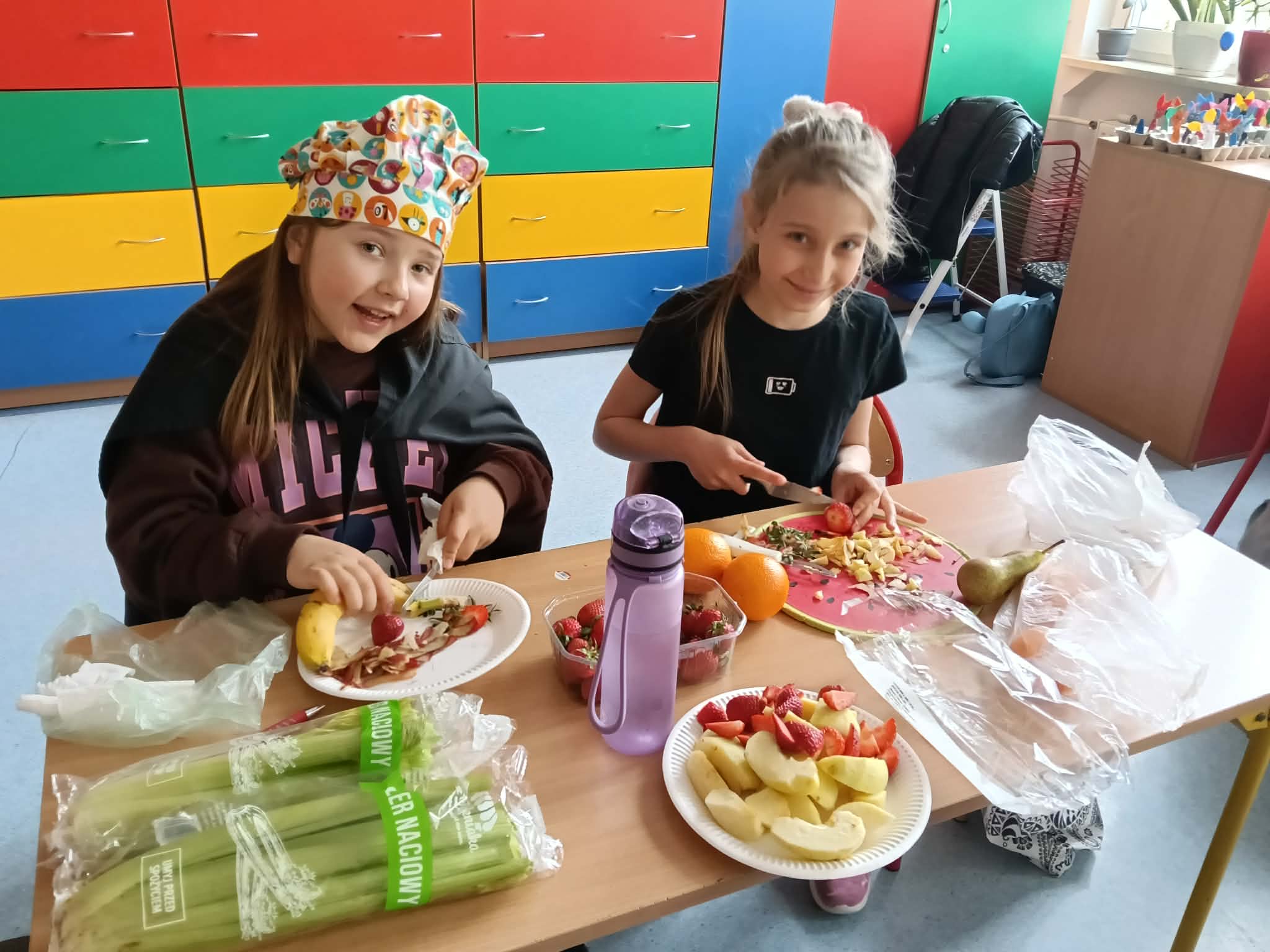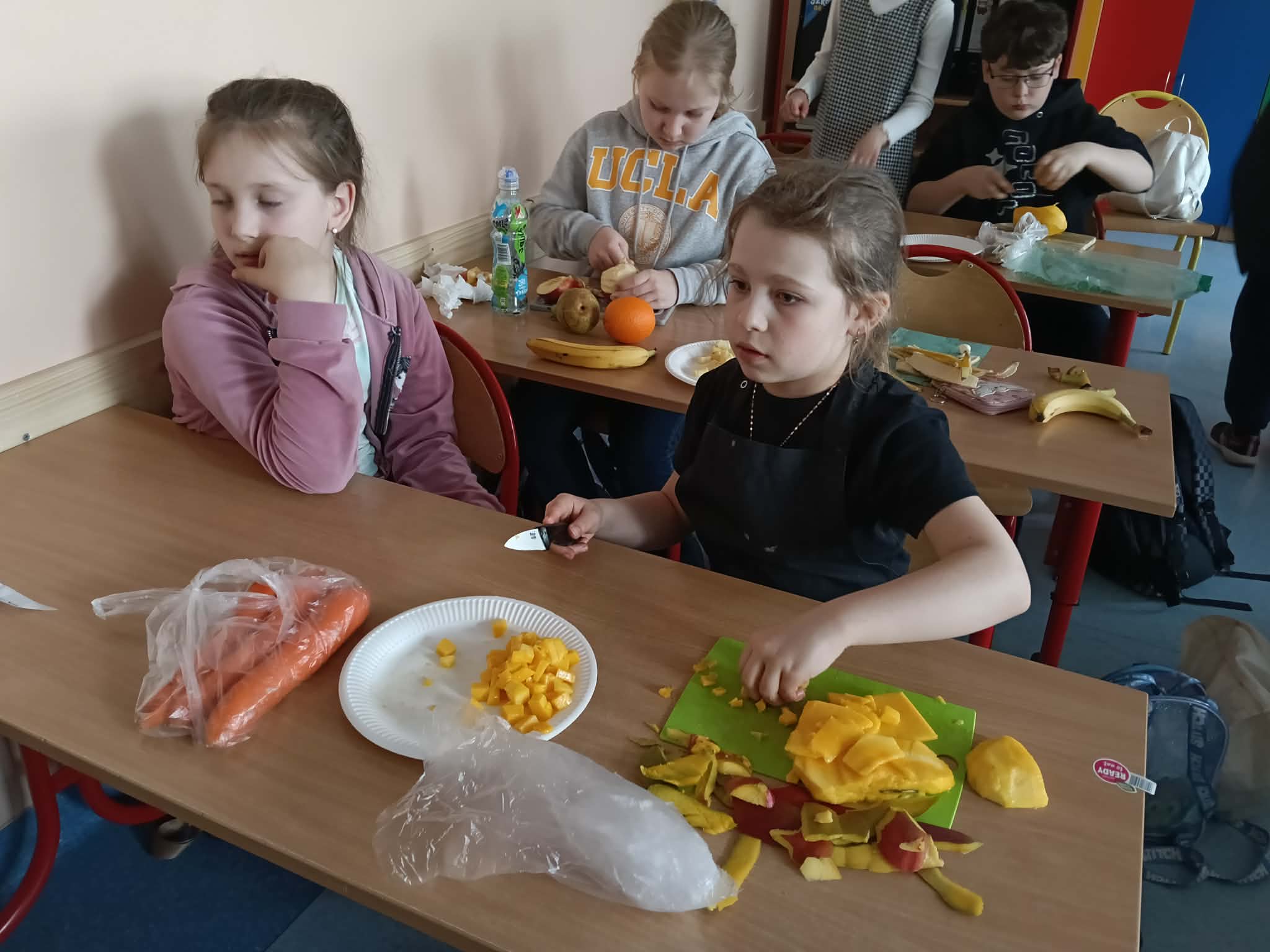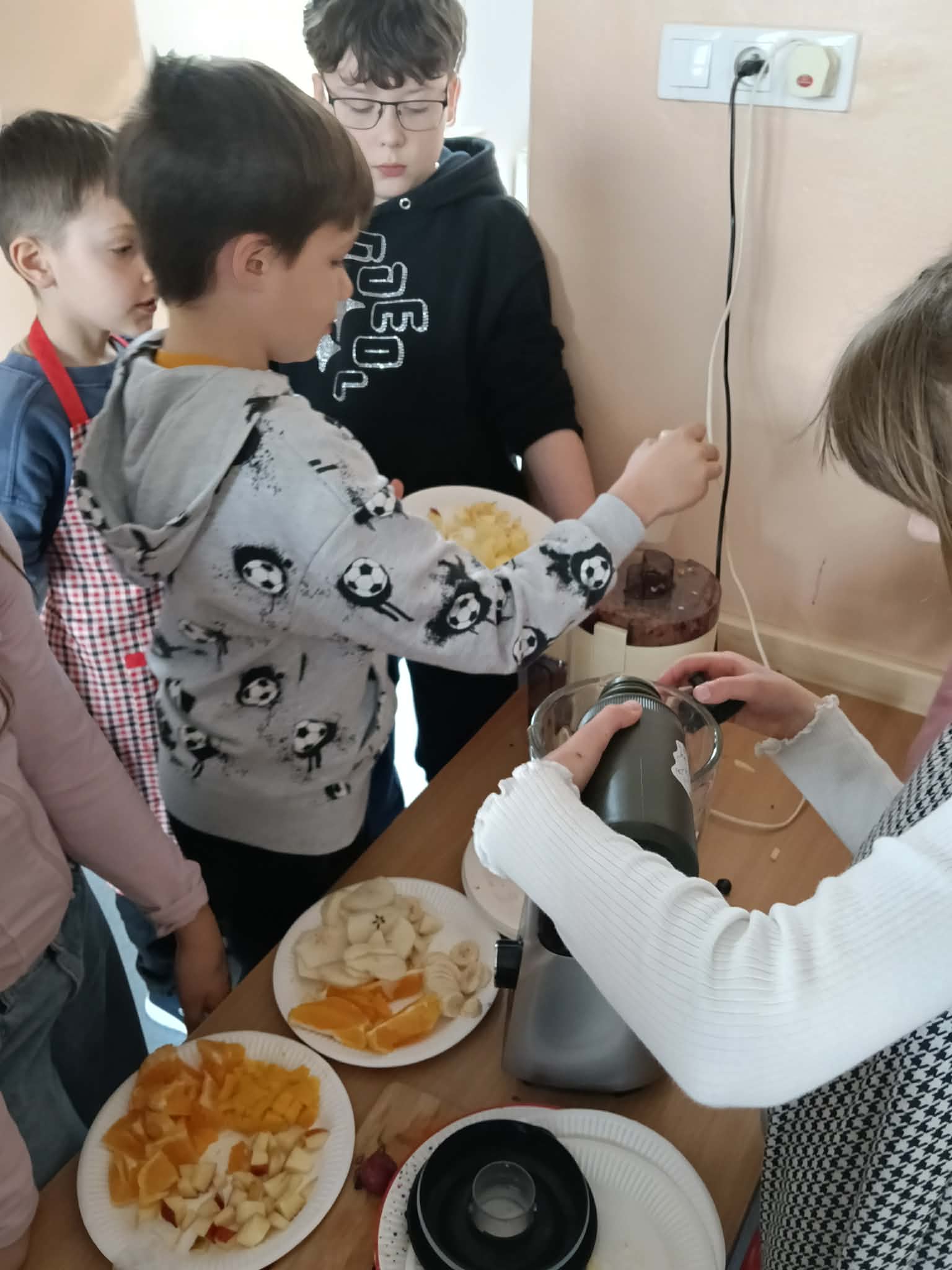 Kluczowym momentem dnia były warsztaty kulinarne. Klasa 3c zamieniła się w zespół kucharzy! Uczniowie samodzielnie myli, obierali i kroili owoce oraz warzywa, przygotowując pyszne, witaminowe soki i koktajle. Dzieci chętnie eksperymentowały ze smakami, łącząc m.in. jabłka z marchewką, banany ze szpinakiem oraz truskawki z borówkami.