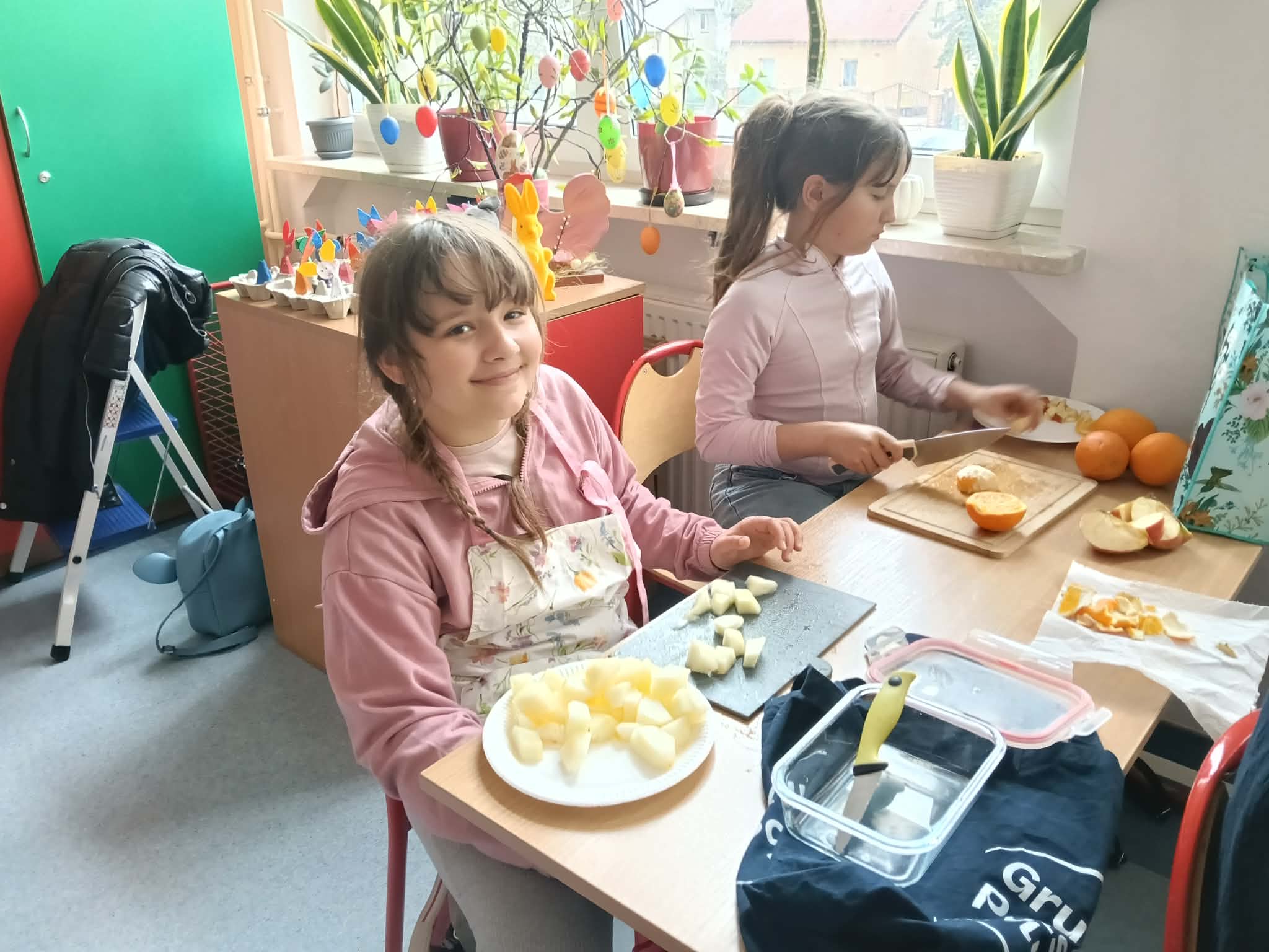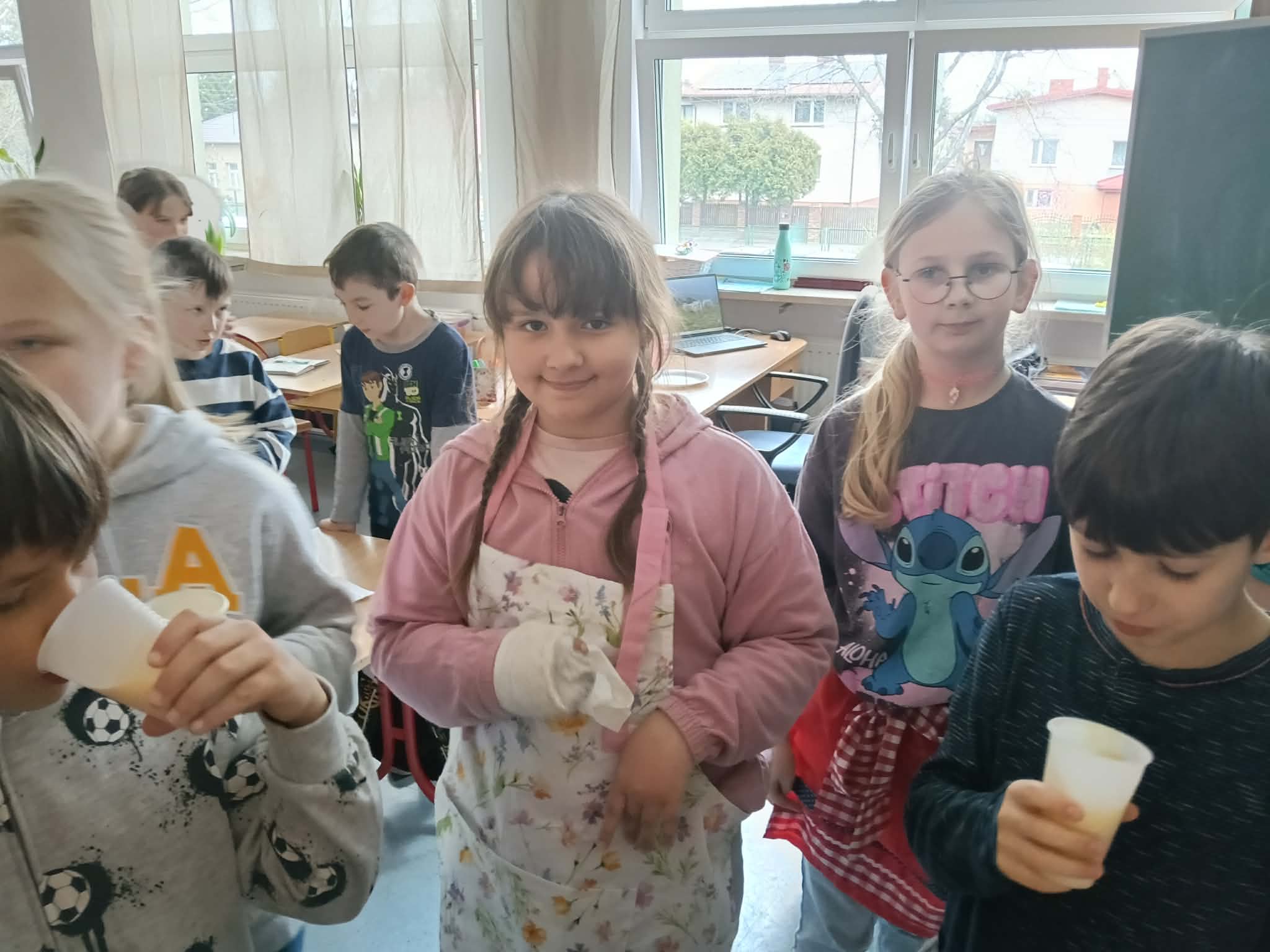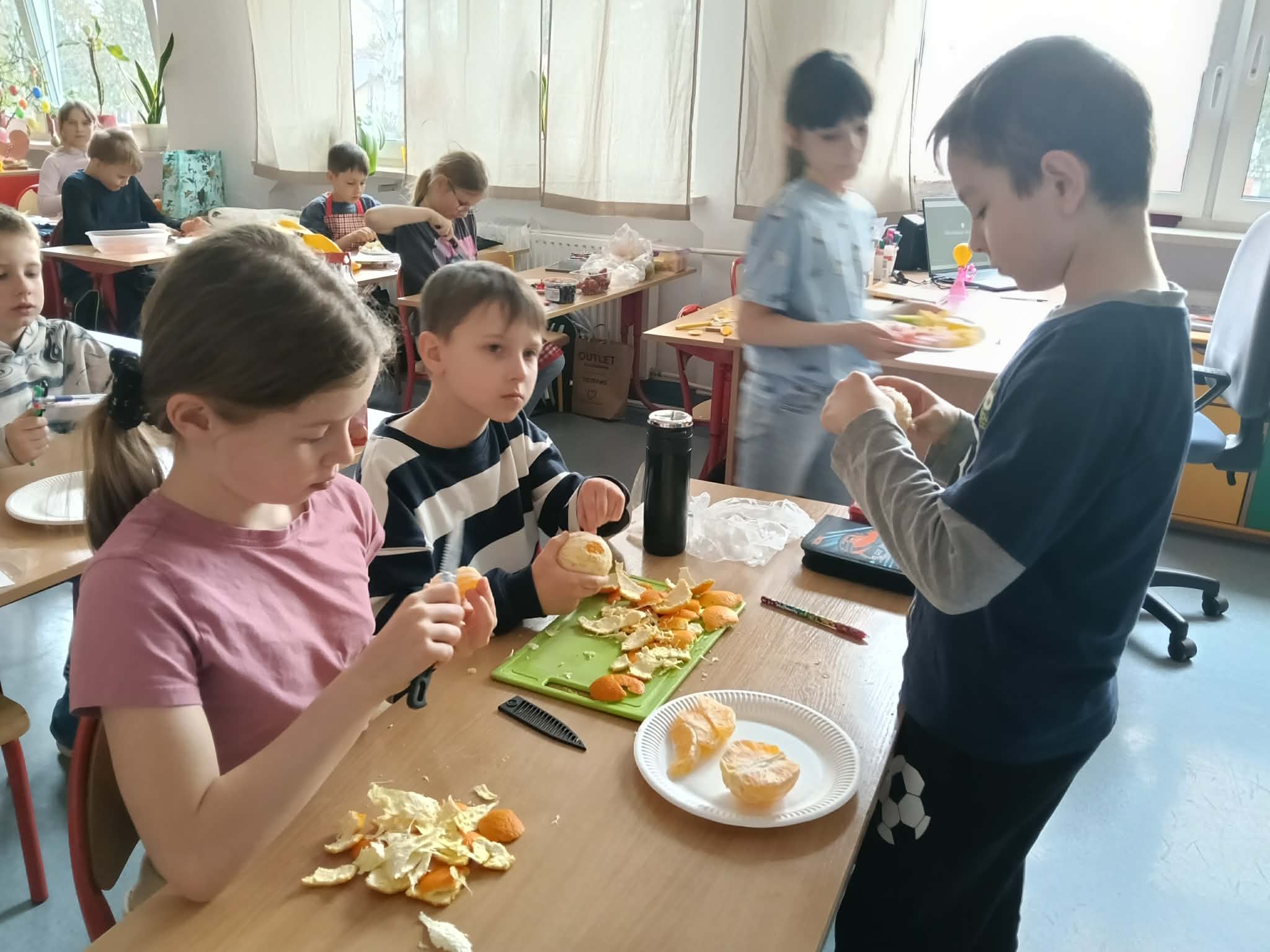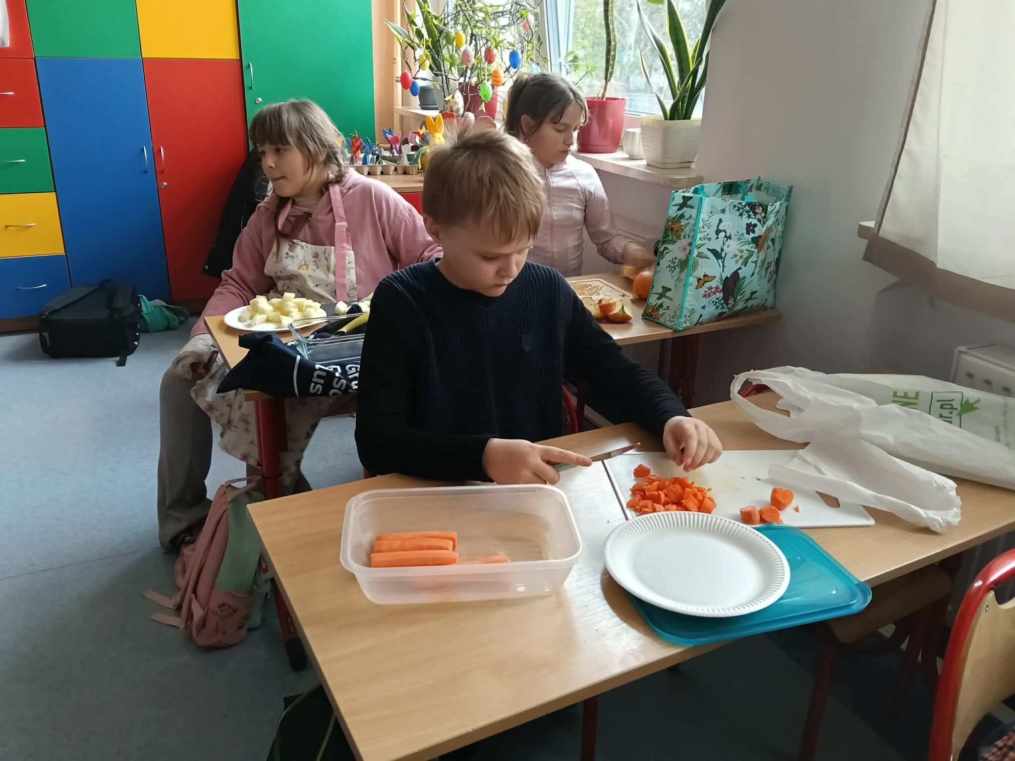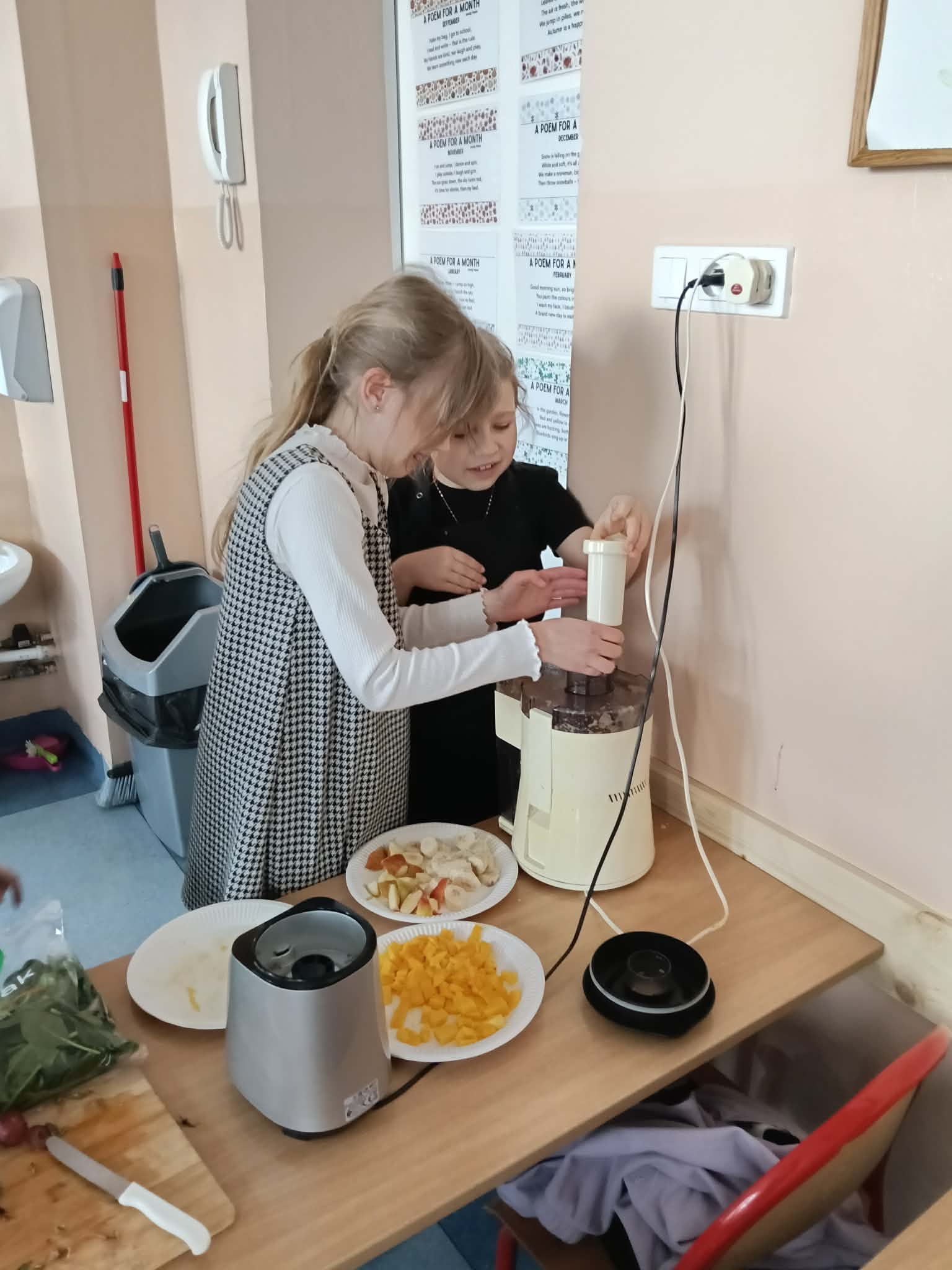 Kluczowym momentem dnia były warsztaty kulinarne. Klasa 3c zamieniła się w zespół kucharzy! Uczniowie samodzielnie myli, obierali i kroili owoce oraz warzywa, przygotowując pyszne, witaminowe soki i koktajle. Dzieci chętnie eksperymentowały ze smakami, łącząc m.in. jabłka z marchewką, banany ze szpinakiem oraz truskawki z borówkami.